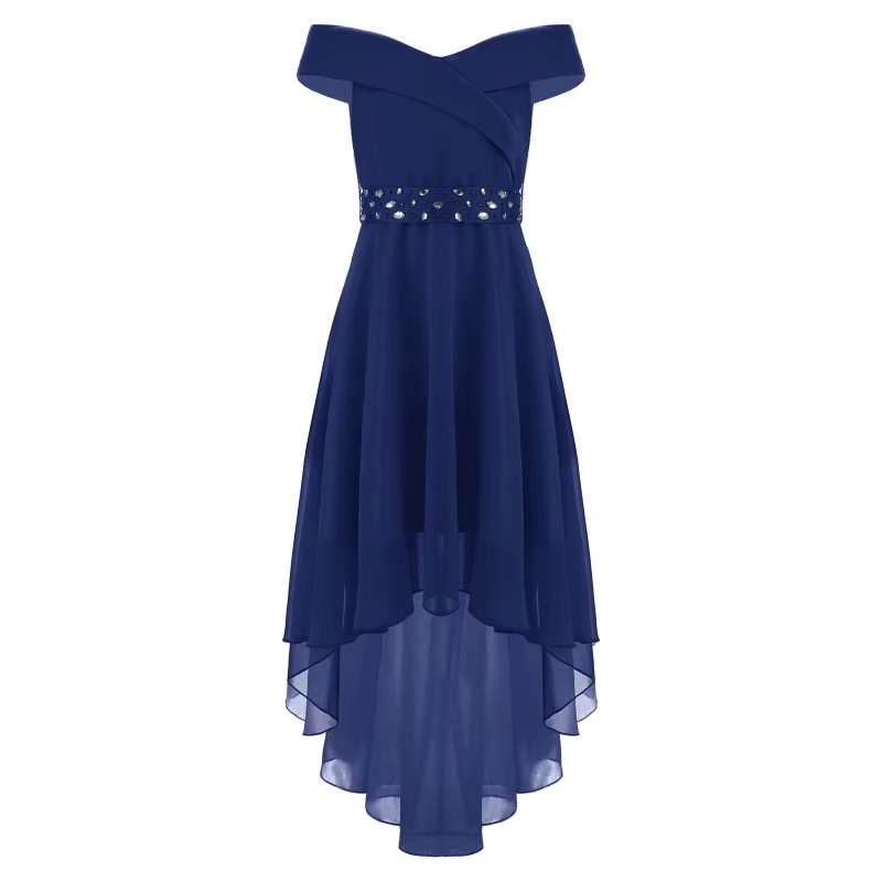 Festkjole til jente og ungdom uten armer og off-sholder. Beltet i livet er fylt med stener og knytes bak. Skjørtet har medium lengde foran og er langt bak. Veldig fin til party, skoleball, bryllup osv. Eks 12 år - 152 cm høyde